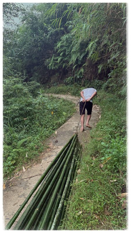 Quand vient le moment, deux ou trois habitants montent ensemble pour couper les bambous secs.