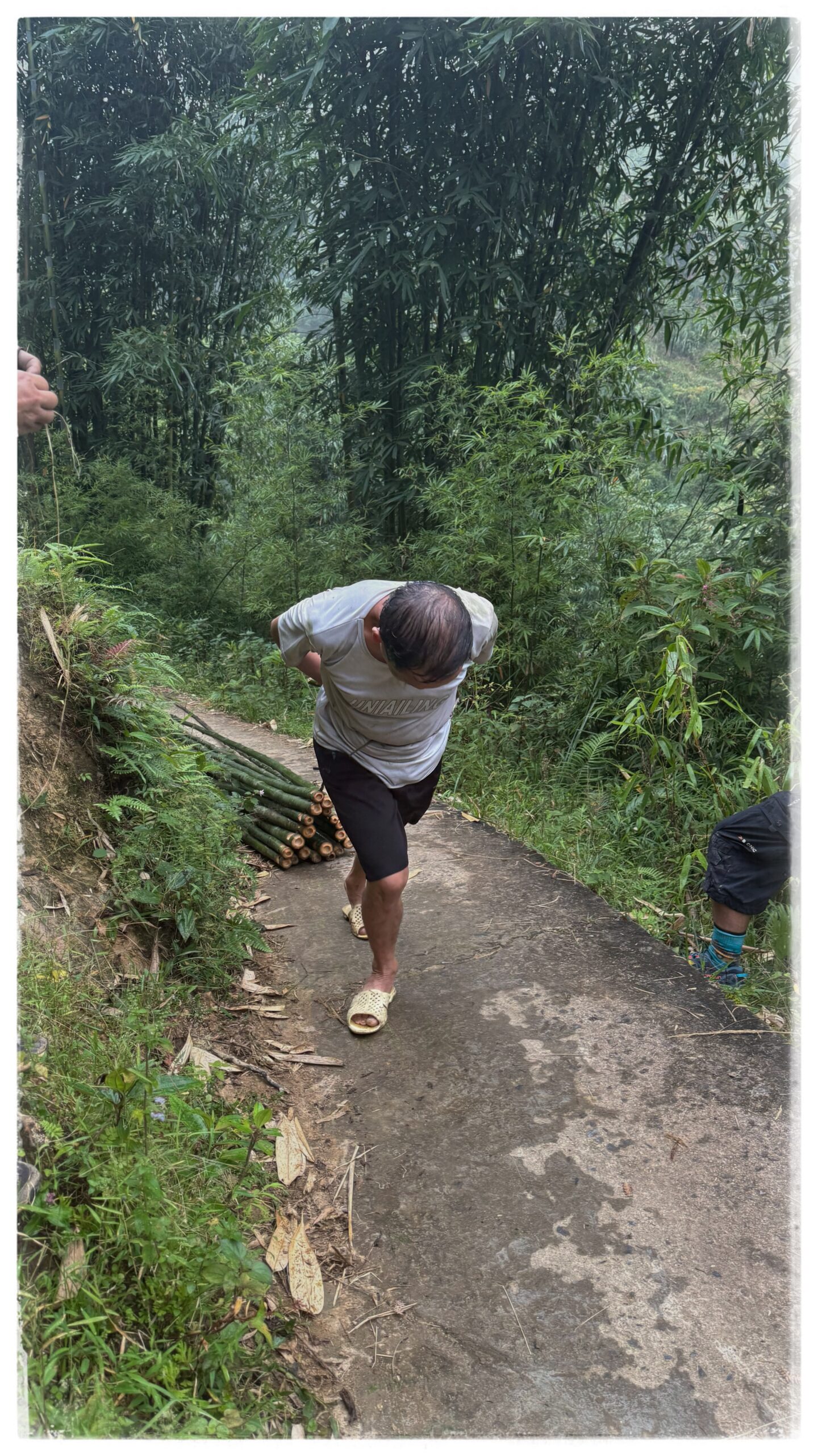 Quand vient le moment, deux ou trois habitants montent ensemble pour couper les bambous secs.