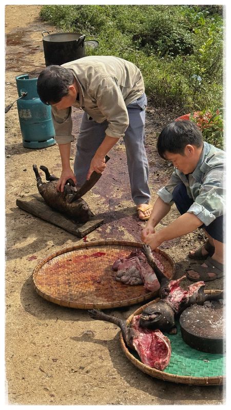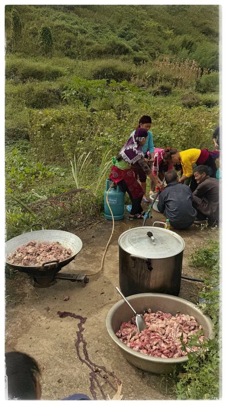 En partant de ce village, nous assistons à la préparation de funérailles. La personne devait être importante aux vues de toute la nourriture en préparation…