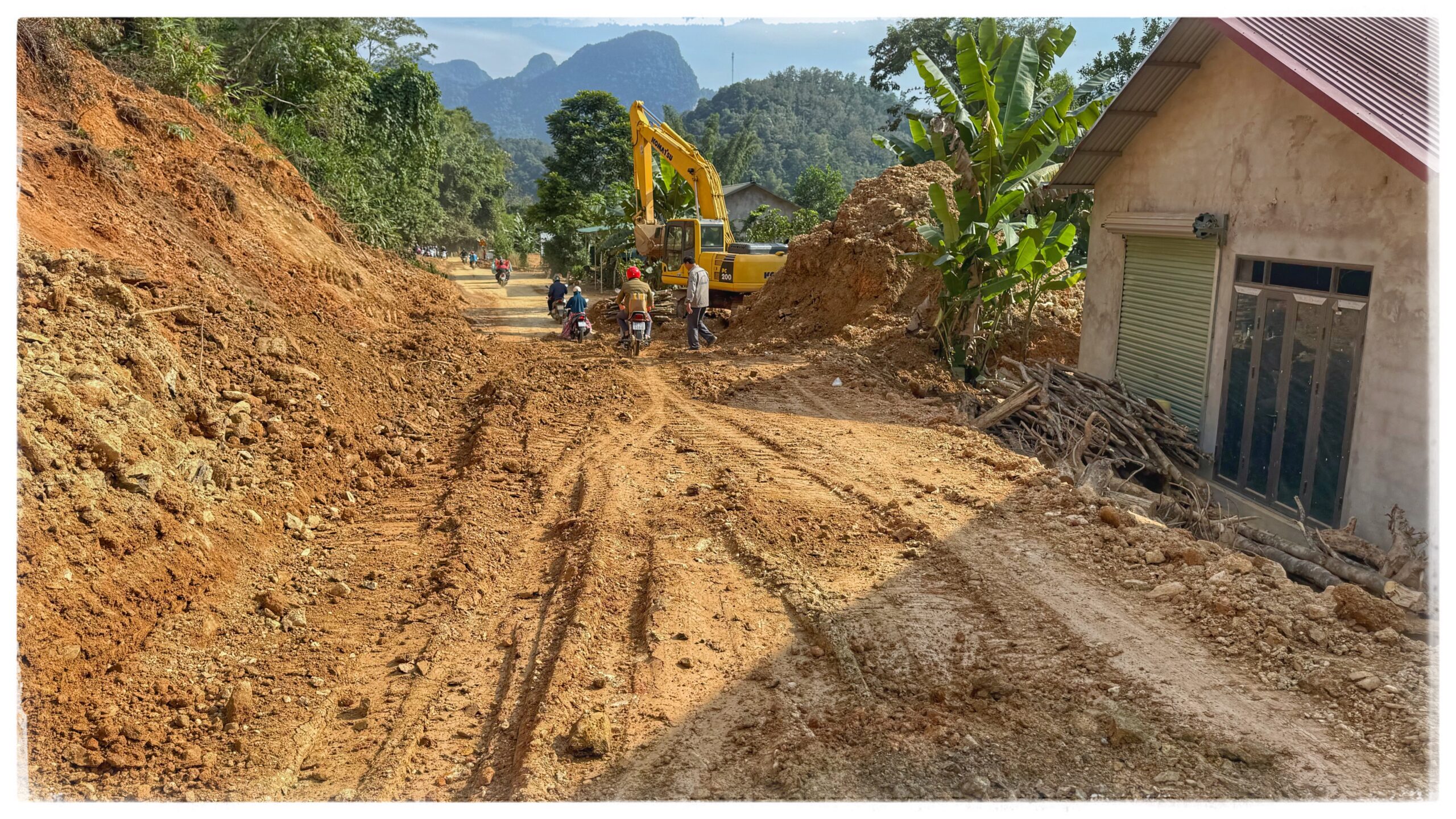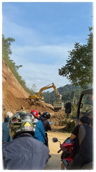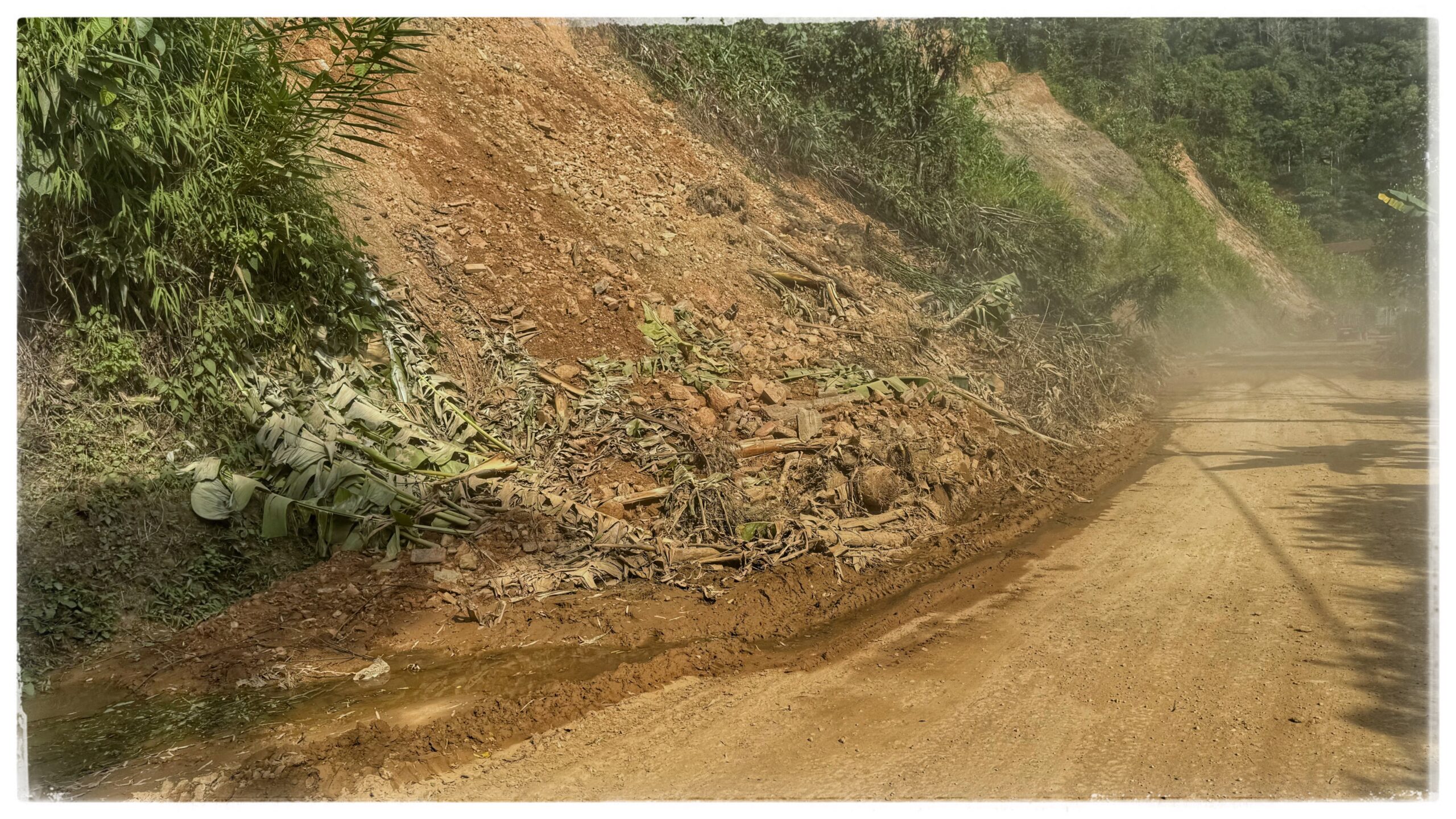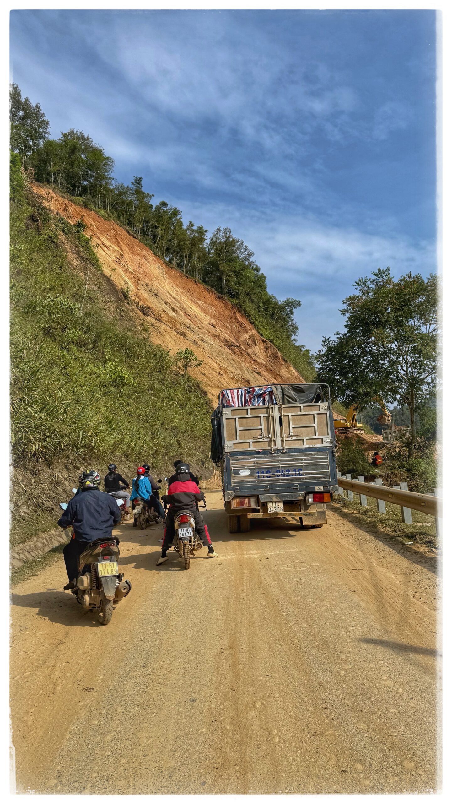 Lorsque la route s’écroule, nous devons parfois patienter près de 30´ le temps que les camions évacuent la terre et les cailloux. De quoi faire une sieste pour certains …