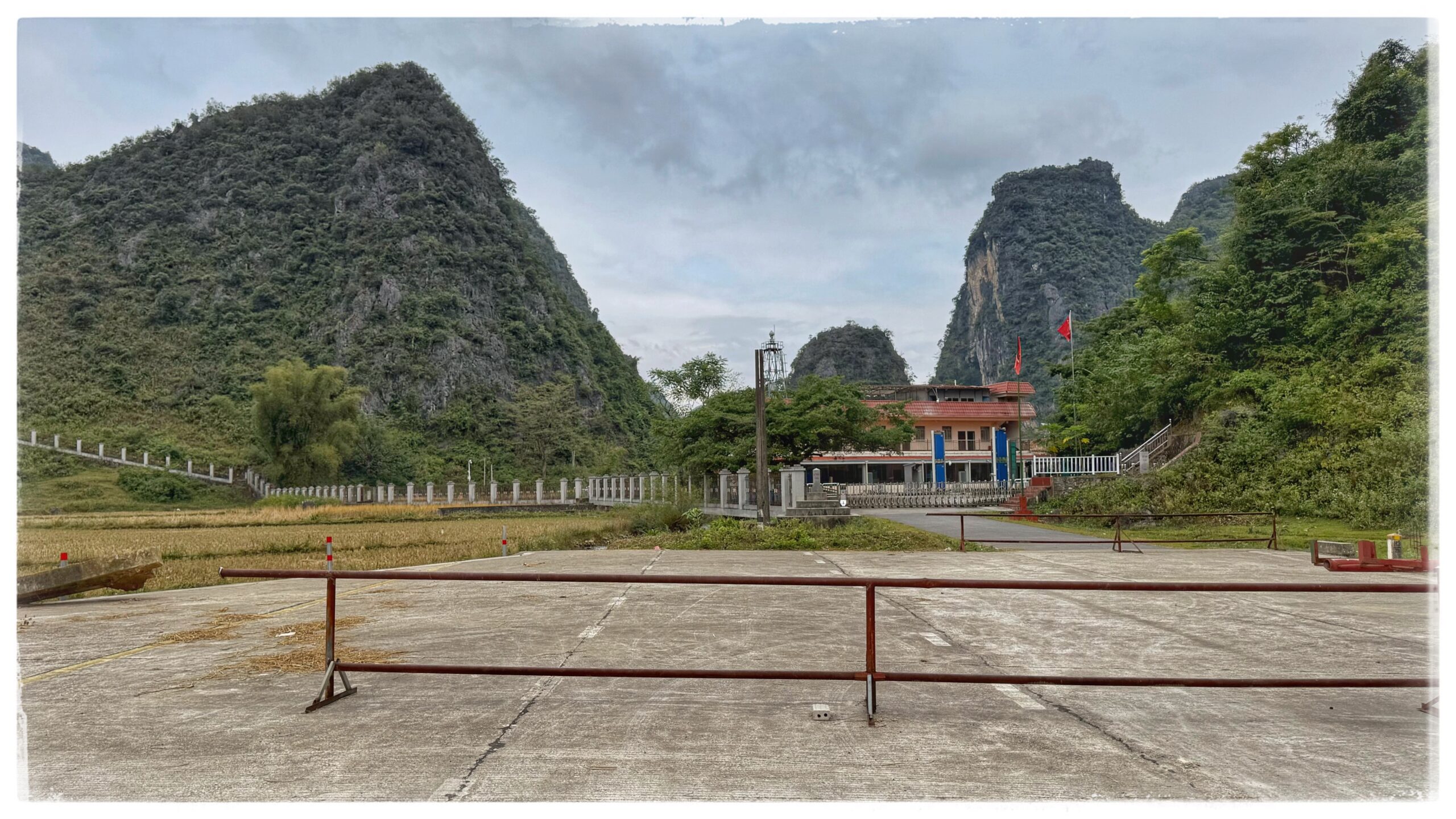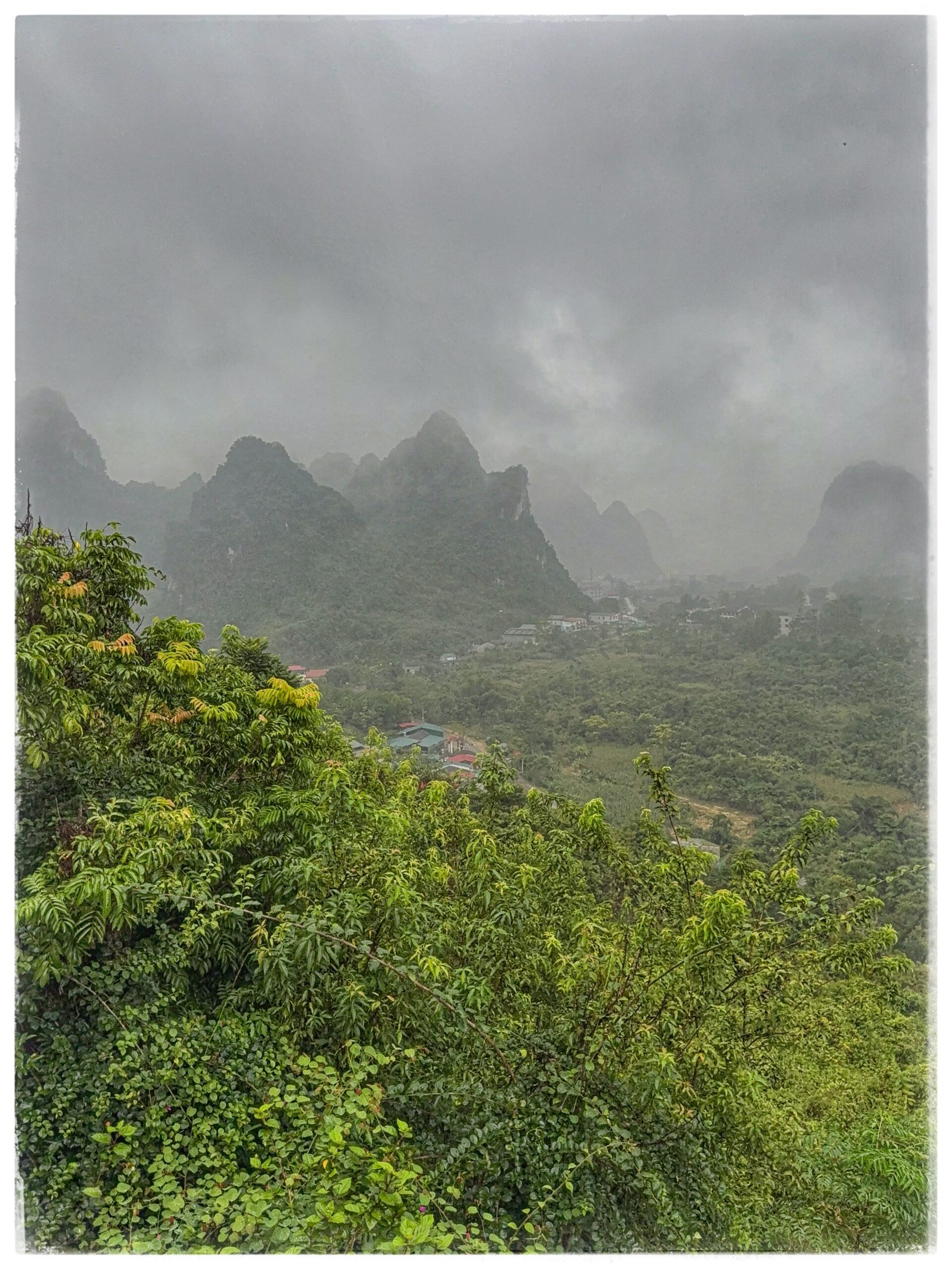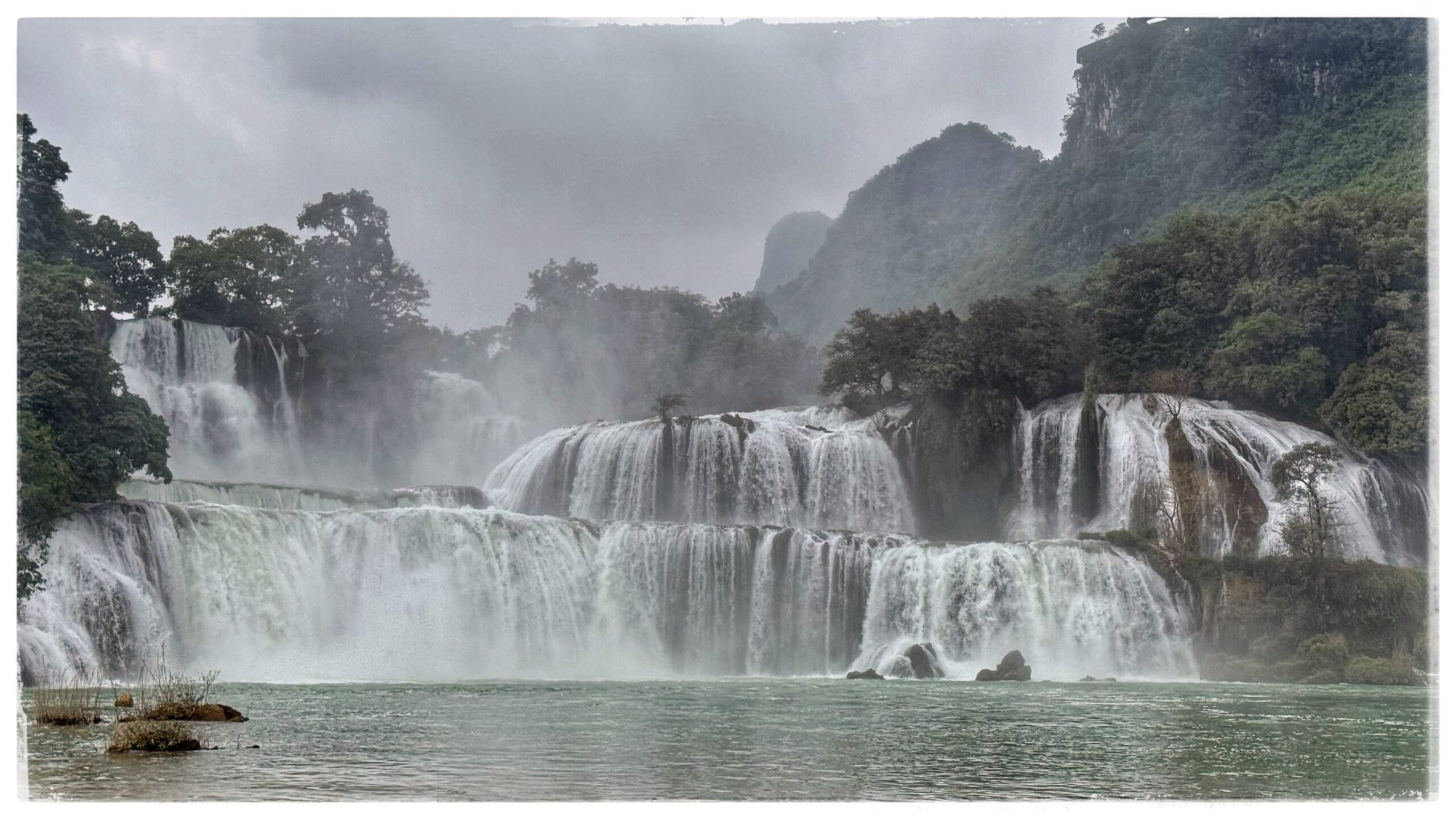 Depuis la terrasse supérieure, la vue est saisissante : les chutes de Bản Giốc en contrebas, la Chine à portée de regard, et tout autour, les montagnes karstiques qui se succèdent à l’infini.